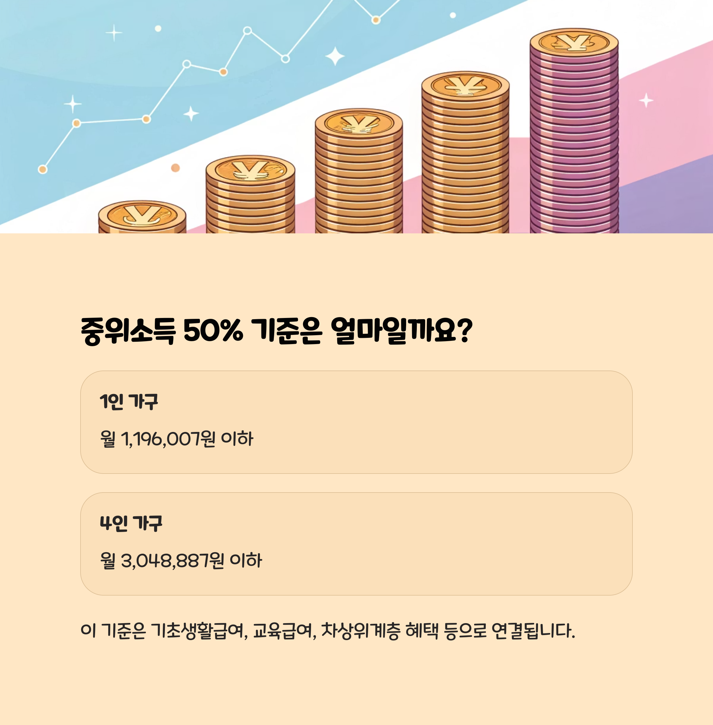 2025년 기준, 중위소득 50% 이하 소득인정액은 1인가구는 월 1,196,007원, 4인가구는 3,048,887원 이하입니다.