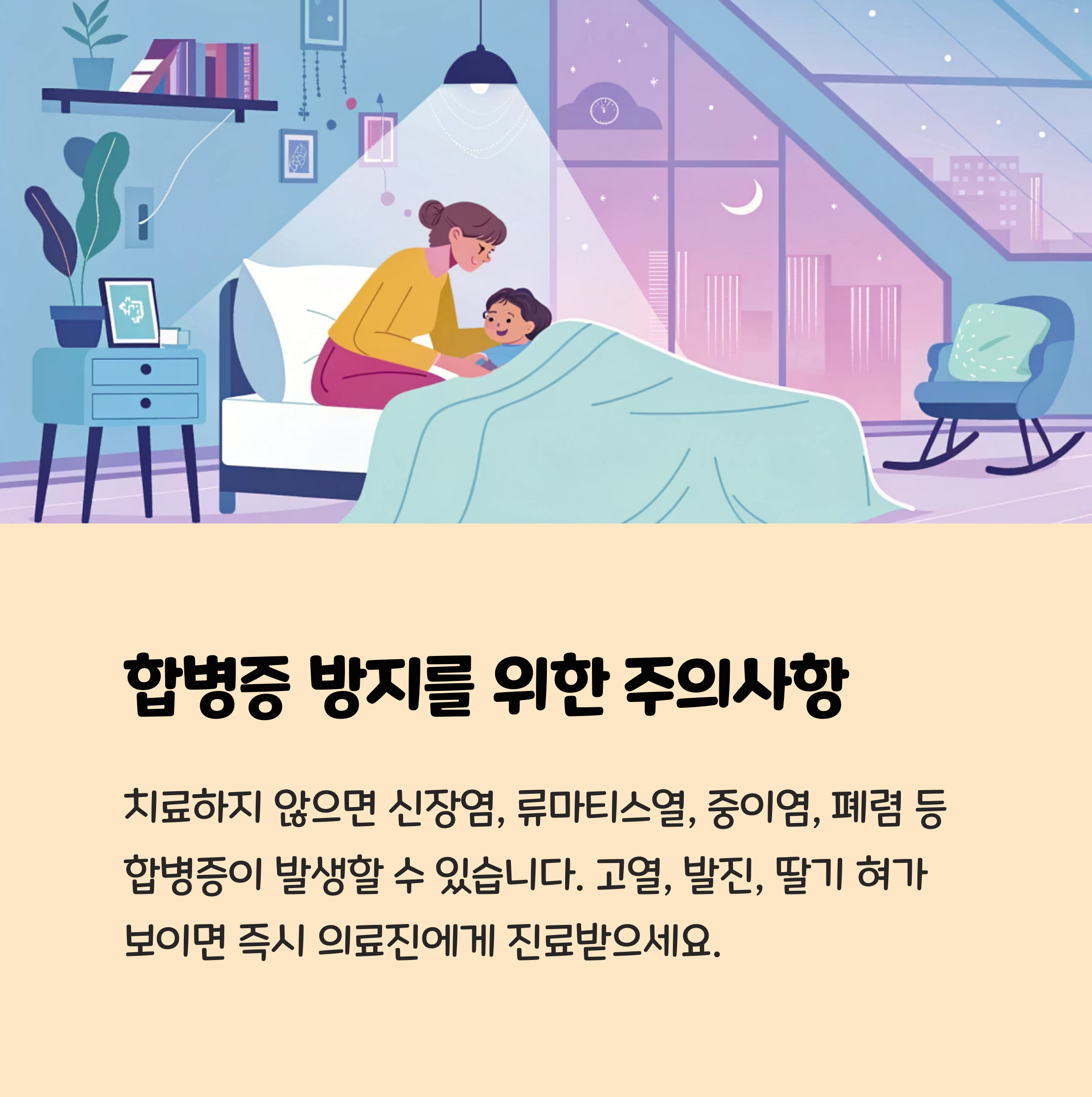 성홍열의 적절한 치료가 이루어지지 않을 경우, 신장염, 류마티스열, 중이염, 폐렴 등 합병증이 발생할 수 있습니다. 따라서 고열과 발진, 딸기 혀가 보일 경우 지체하지 말고 의료진에게 진료받는 것이 중요합니다. 빠른 치료와 관리가 건강한 회복을 돕습니다.