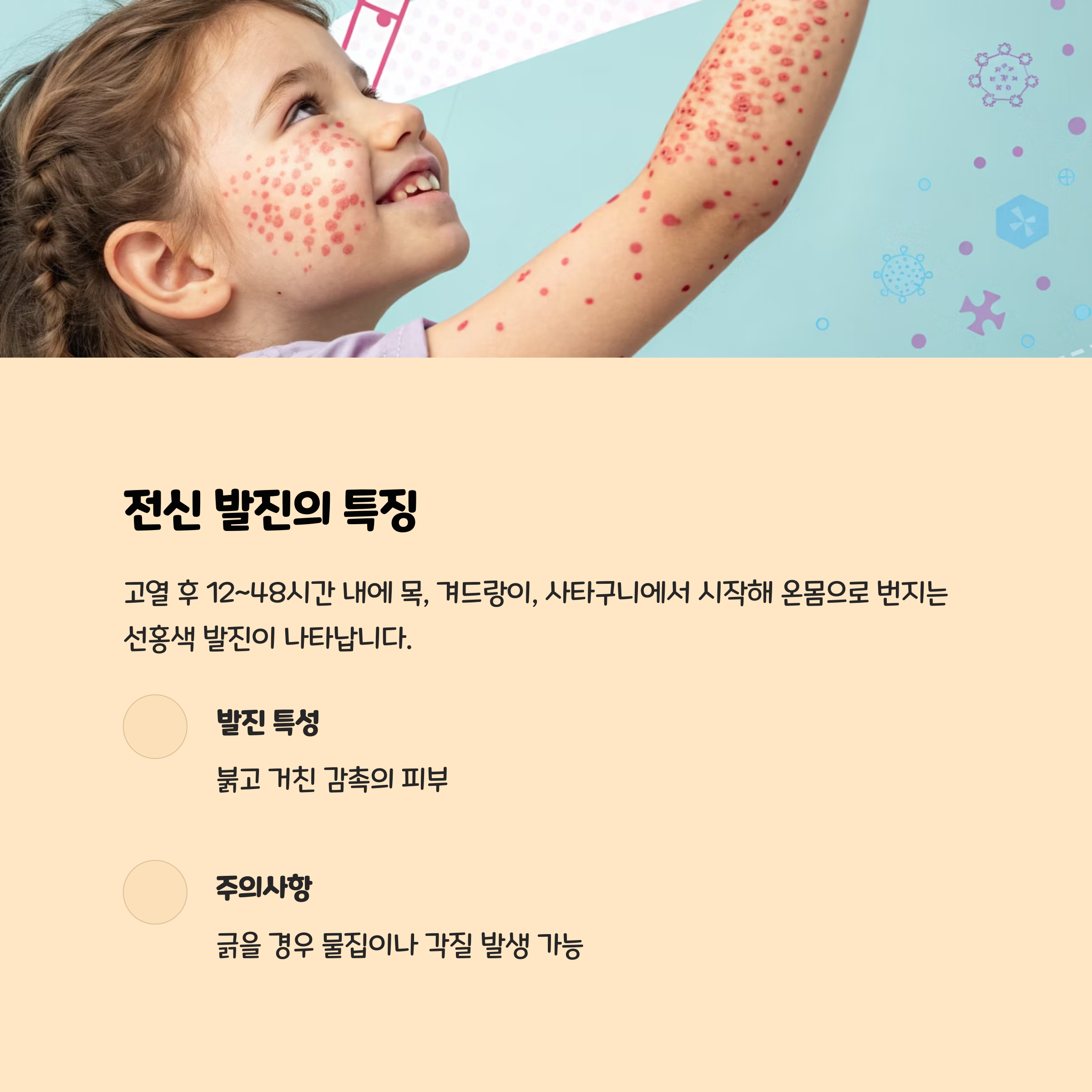 대부분 고열 후 12~48시간 내에 목과 겨드랑이, 사타구니 등에서 시작해 온몸으로 번지는 선홍색 발진이 나타납니다. 이 발진이 퍼지면서 피부가 붉고 거친 감촉을 보이게 되며, 긁을 경우 물집이나 각질이 생길 수 있습니다. 이런 발진은 성홍열의 대표적인 특징으로, 아이의 상태를 눈으로 확인할 수 있는 중요한 단서입니다.