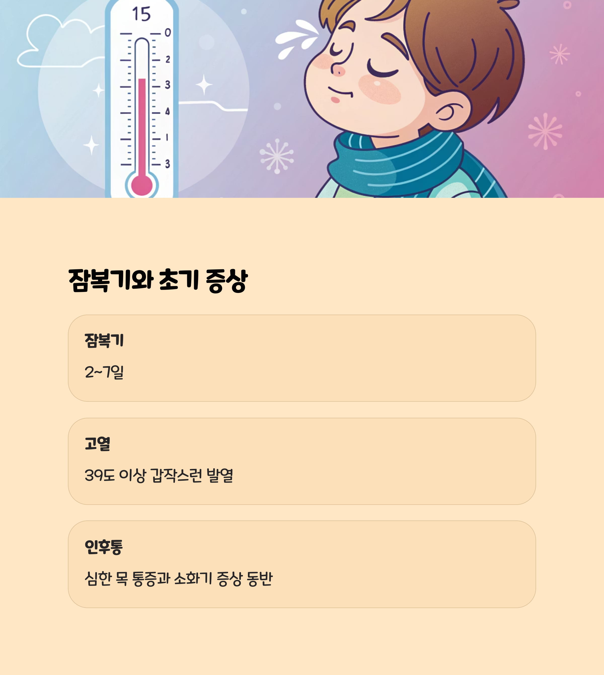 성홍열의 잠복기는 일반적으로 2~7일입니다. 이 기간을 지나면 갑자기 39도 이상의 고열과 함께 심한 인후통이 나타납니다. 일부 어린이는 구토, 복통, 식욕부진 등의 소화기 증상을 동반하기도 합니다. 특히 고열이 동반된 목통증으로 인해 아이들이 급격히 힘들어하는 경우가 많습니다.