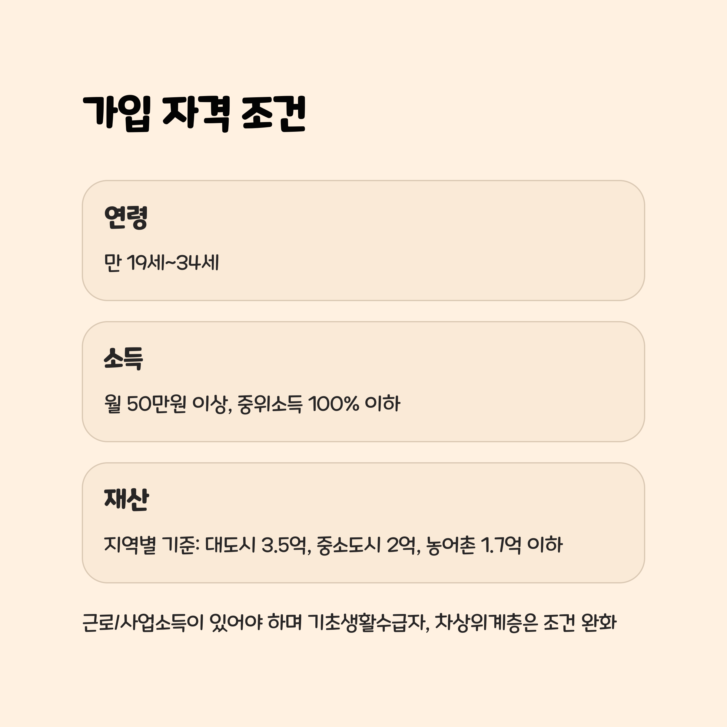 | 소득 | 근로·사업소득 월 50만 원 이상, 중위소득 100% 이하 |