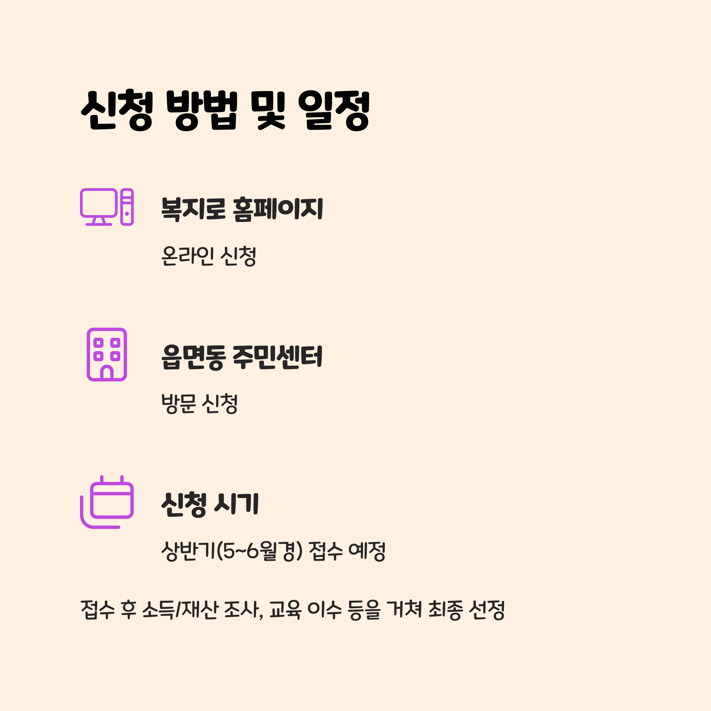 접수 후 소득 및 재산 조사, 교육 이수 등을 거쳐 최종 선정됩니다.