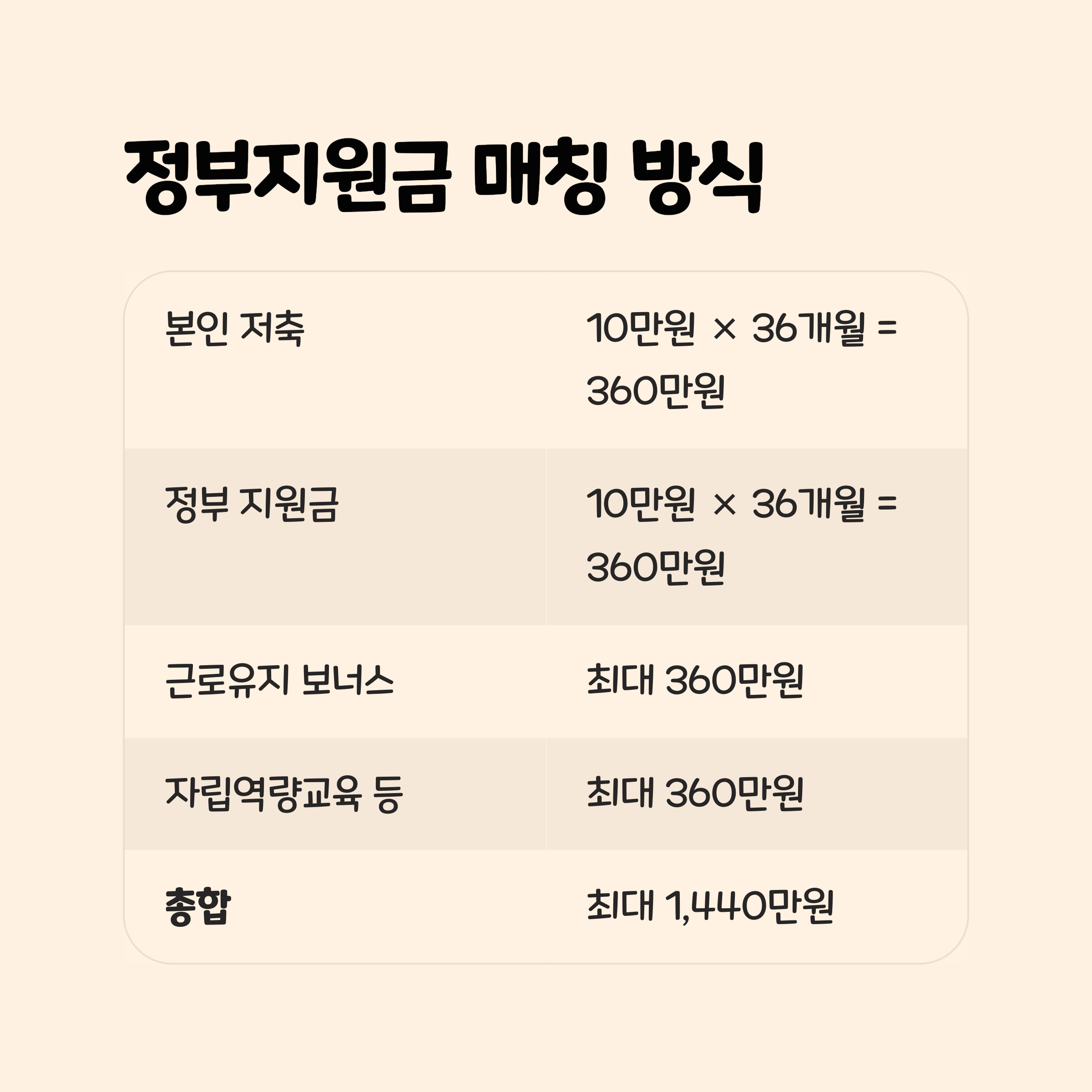 | 본인 저축 | 10만 원 × 36개월 = 360만 원 |