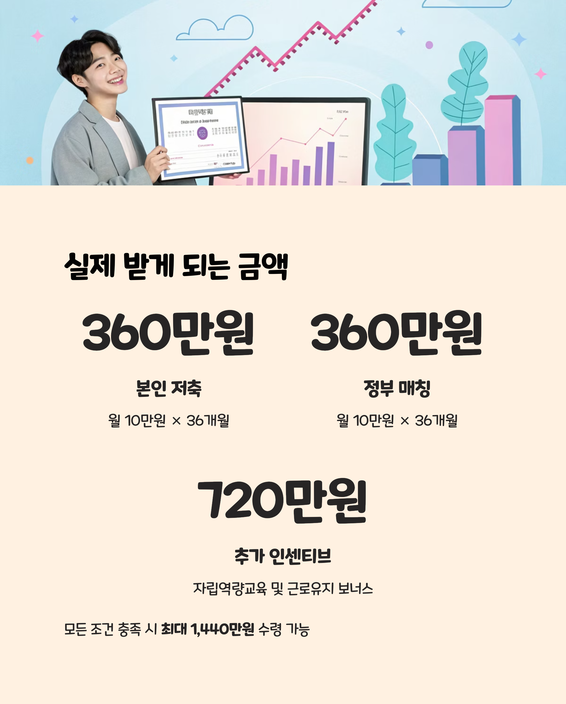 총 1,440만 원(본인 저축 360만 원 + 정부지원금 최대 1,080만 원)을 받을 수 있습니다.