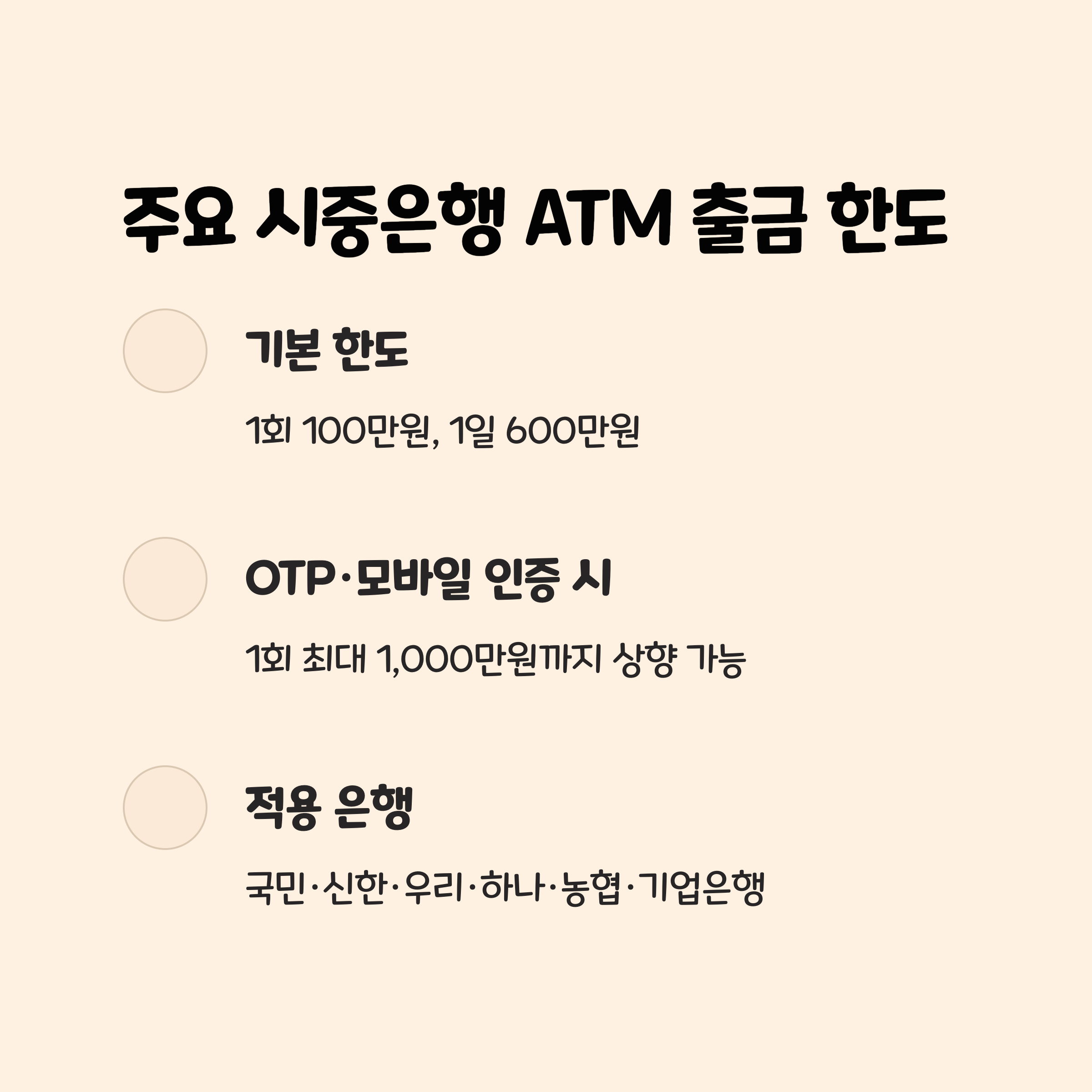 2025년 기준, 국민·신한·우리·하나·농협·기업 등 주요 시중은행의 ATM 출금 한도는 1회 100만 원, 1일 600만 원이 일반적입니다.