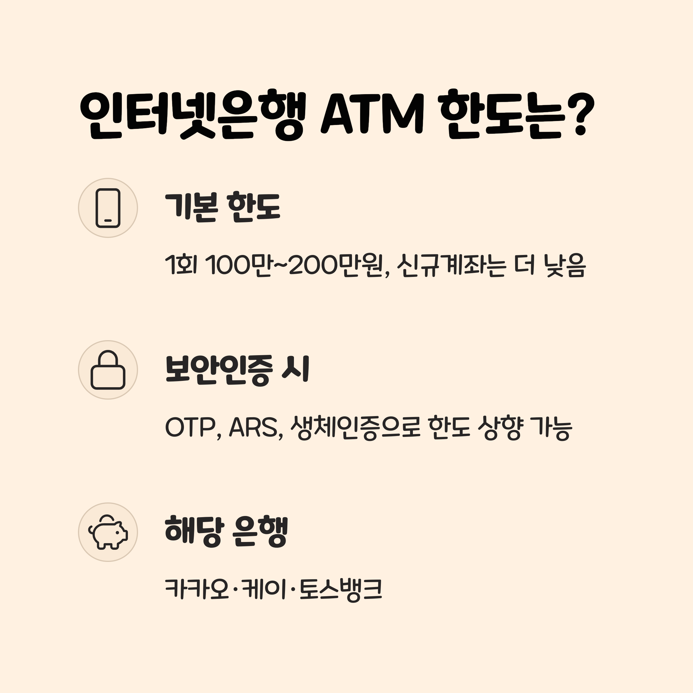 인터넷은행의 ATM 출금 한도는 시중은행보다 낮은 1회 100만~200만 원 수준입니다.