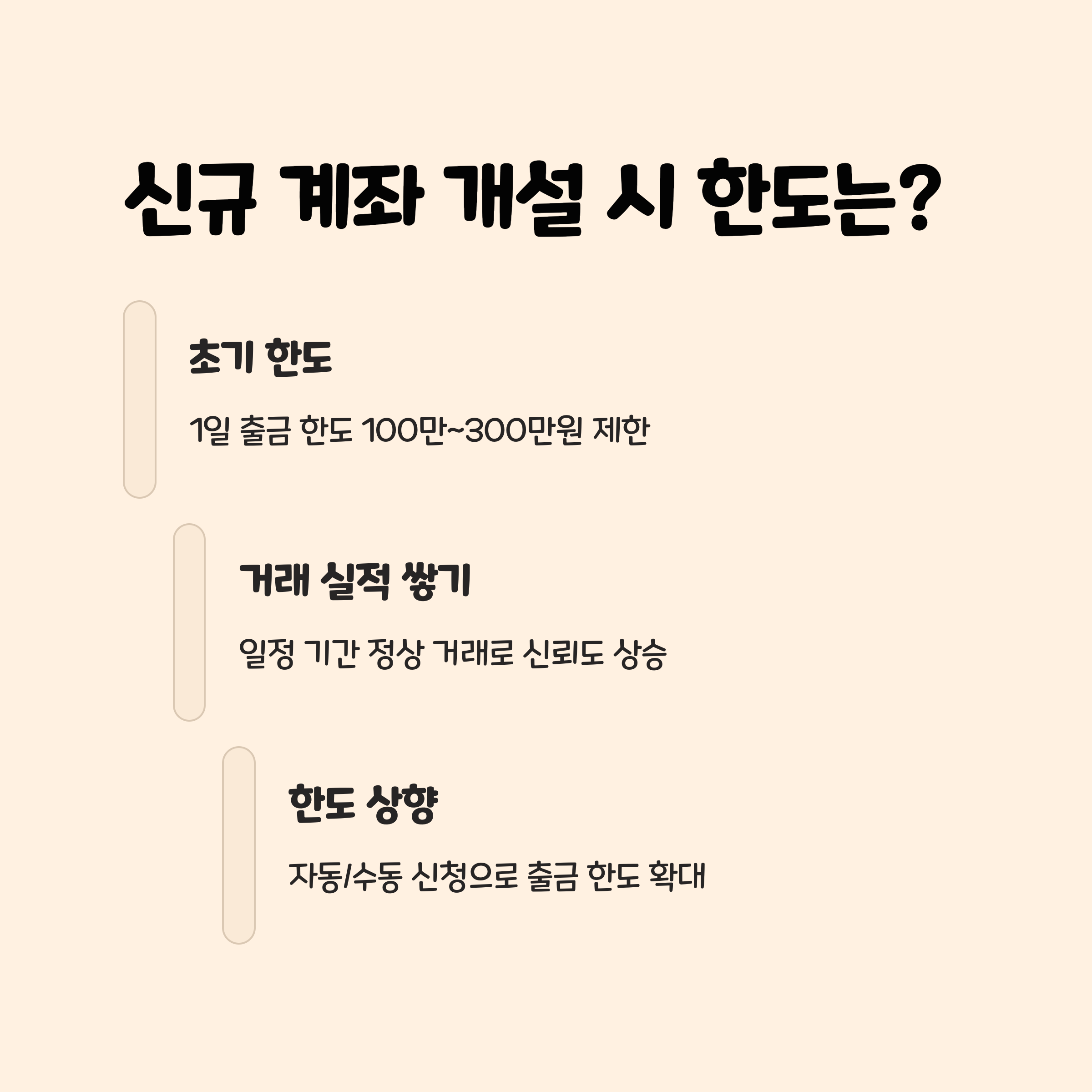 신규 계좌 개설 후에는 1일 출금 한도가 100만~300만 원으로 설정됩니다.