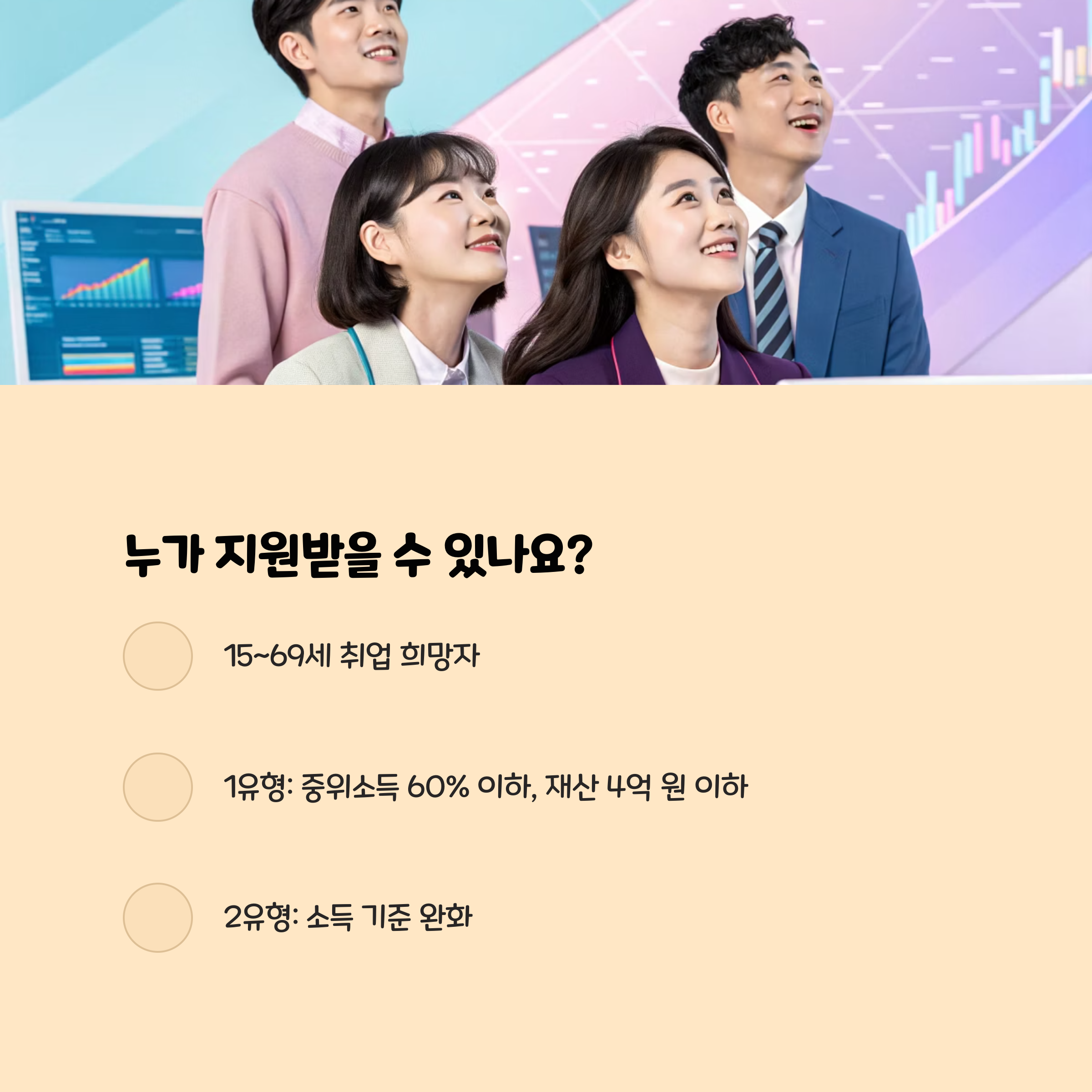 1유형(구직촉진수당 포함)은 중위소득 60% 이하 가구, 재산 4억 원 이하가 대상이며
