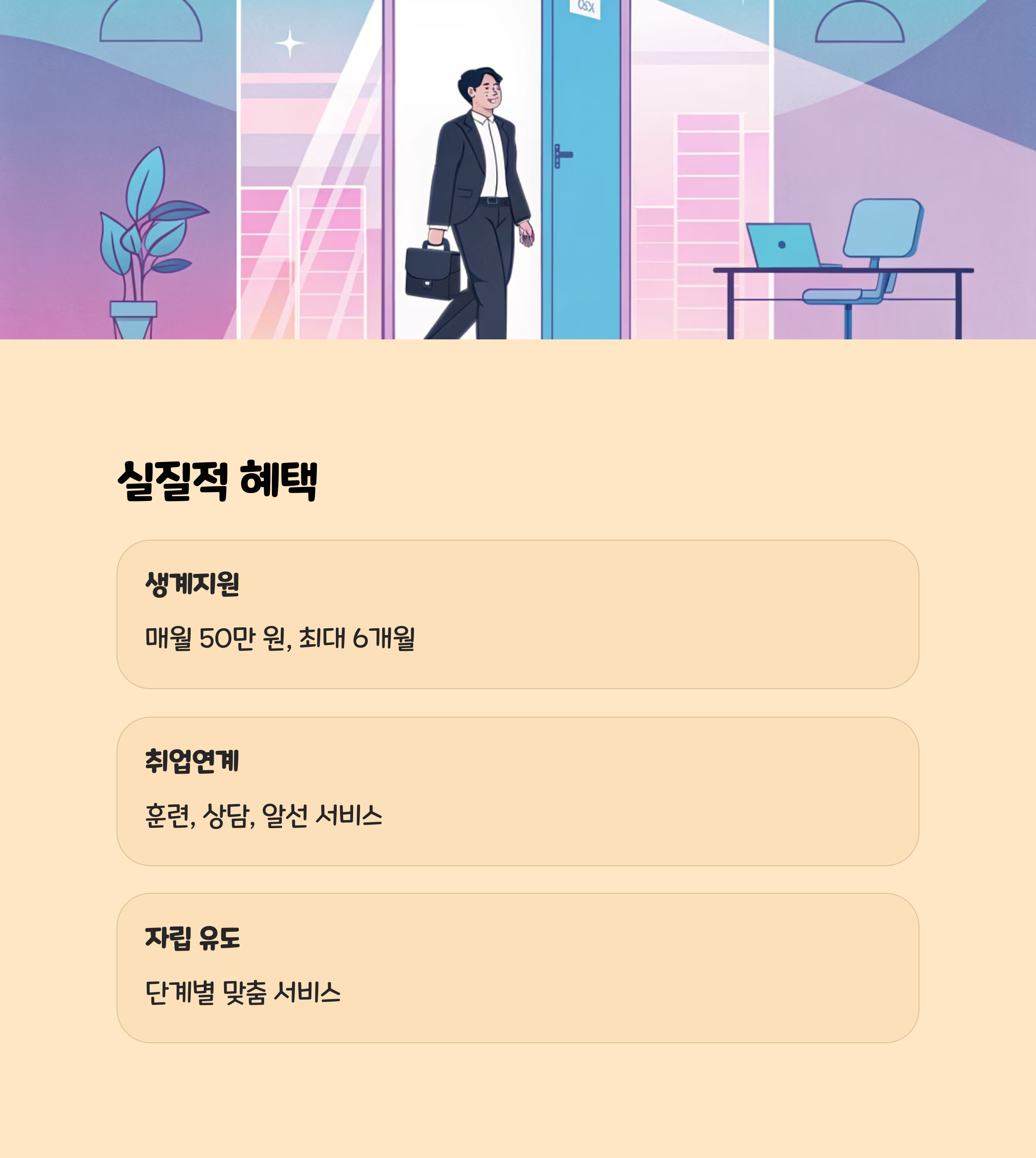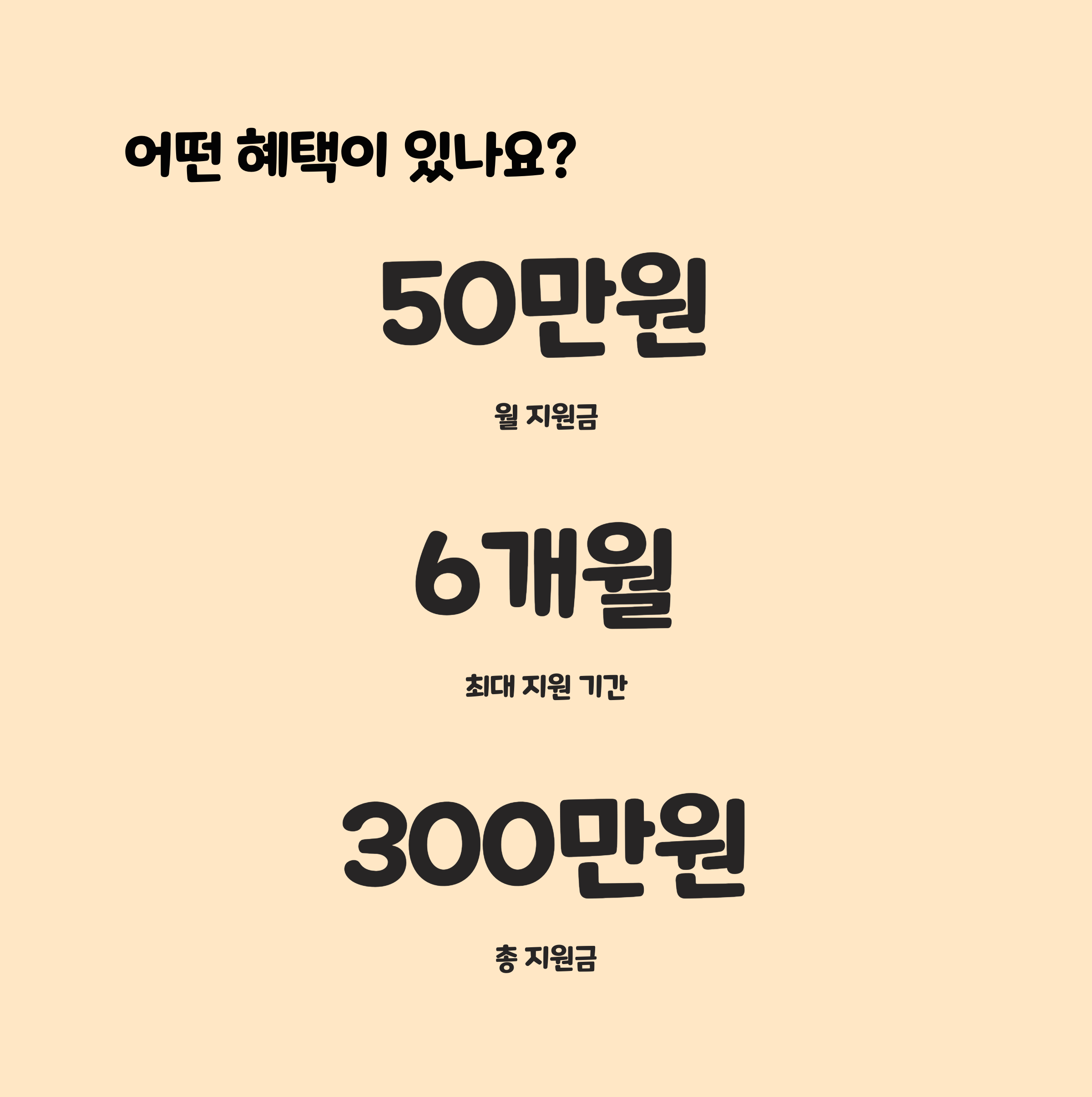| 생계지원 | 매월 50만 원, 최대 6개월 지원 |