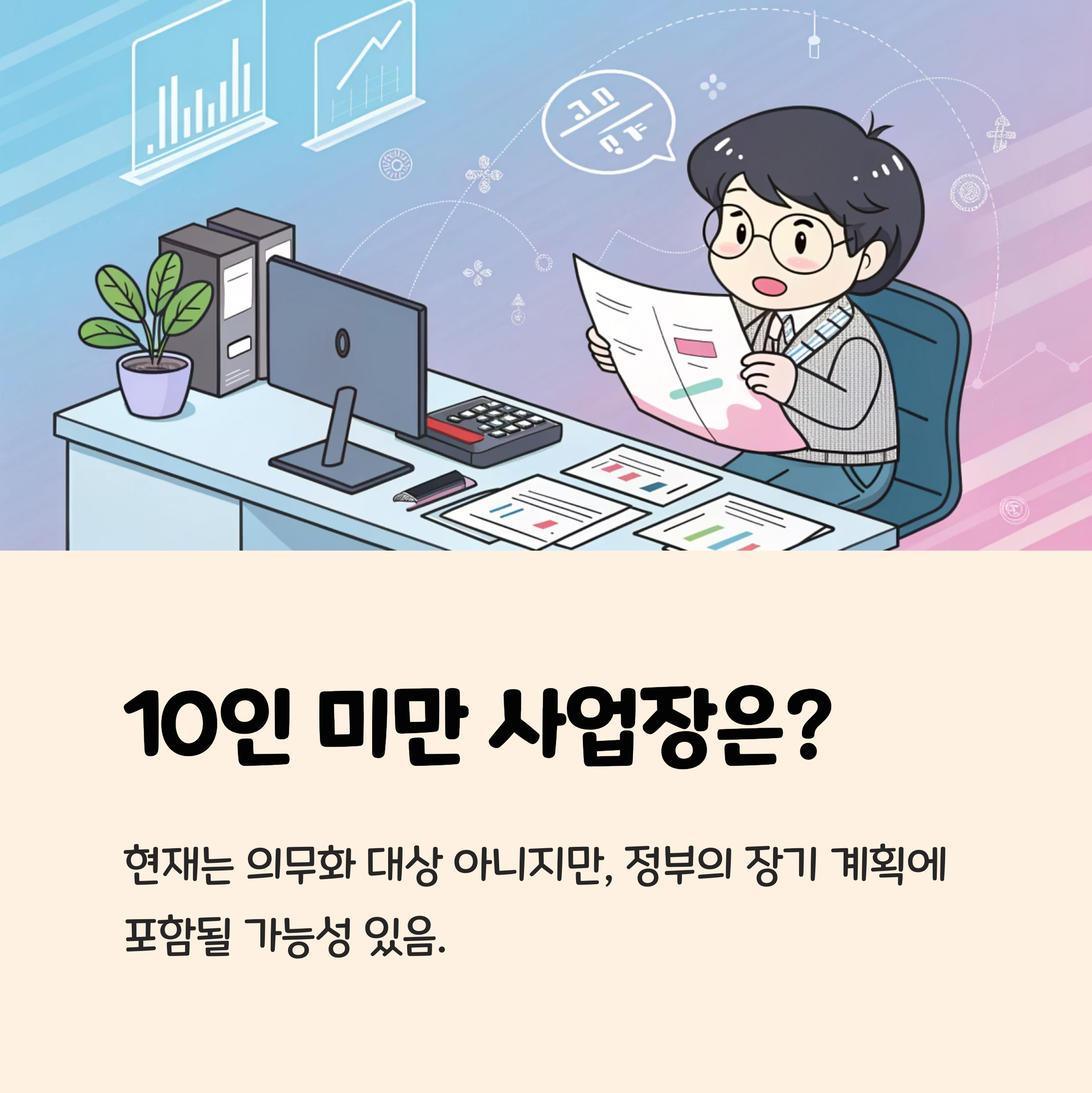 현행 법령상 10인 미만 사업장은 아직까지는 의무화 대상이 아닙니다.