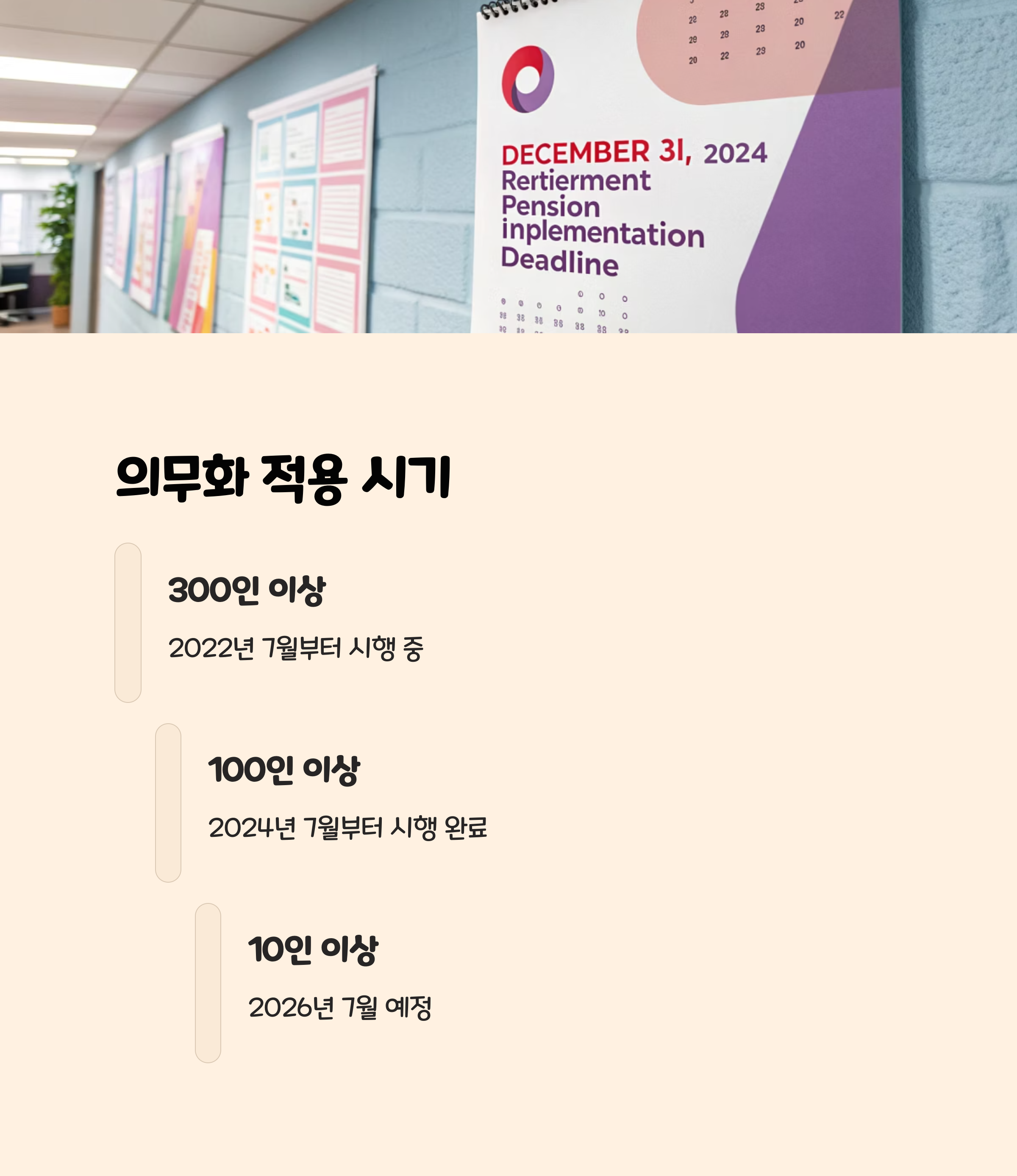 퇴직연금 의무화는 ‘기업규모’에 따라 적용 시점이 다릅니다.