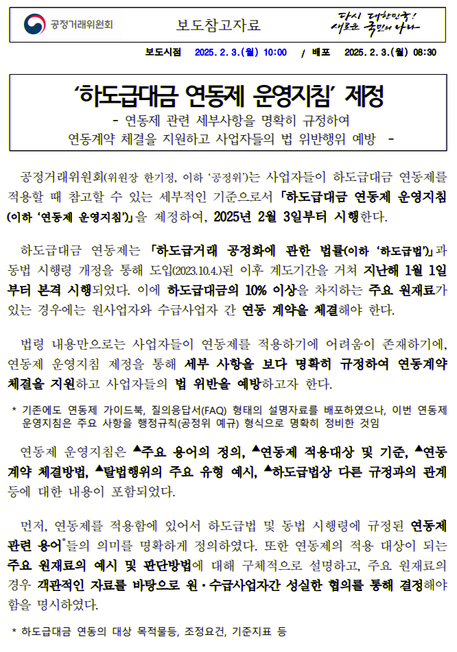 따라서 원사업자와 수급사업자는 연동제를 올바르게 이해하고, 정당한 대금 조정과 지급 절차를 준수하는 것이 중요합니다. 앞으로도 공정위는 연동제의 정착을 위해 적극적으로 지원하고, 불공정 행위가 발생할 경우 엄정하게 조치할 예정입니다.