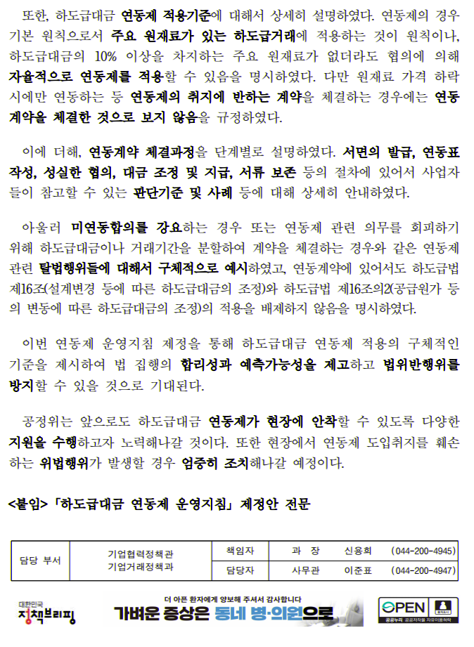 하도급대금 연동제와 운영지침 시행을 통해 기대되는 효과는 다음과 같습니다.