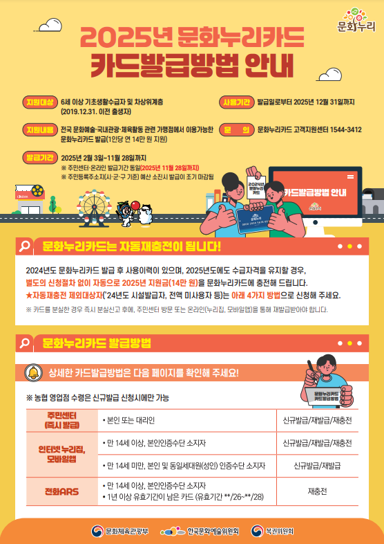 문화누리카드는 정부에서 지원하는 복지카드로, 기초생활수급자 및 차상위계층을 대상으로 지급됩니다. 2025년에는 1인당 11만 원이 지원되며, 이를 활용해 다양한 문화·여행·체육 활동을 즐길 수 있습니다.