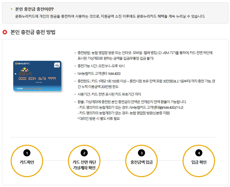 - 충전 방법 : 문화누리카드 홈페이지, 모바일 앱 또는 주민센터에서 가능