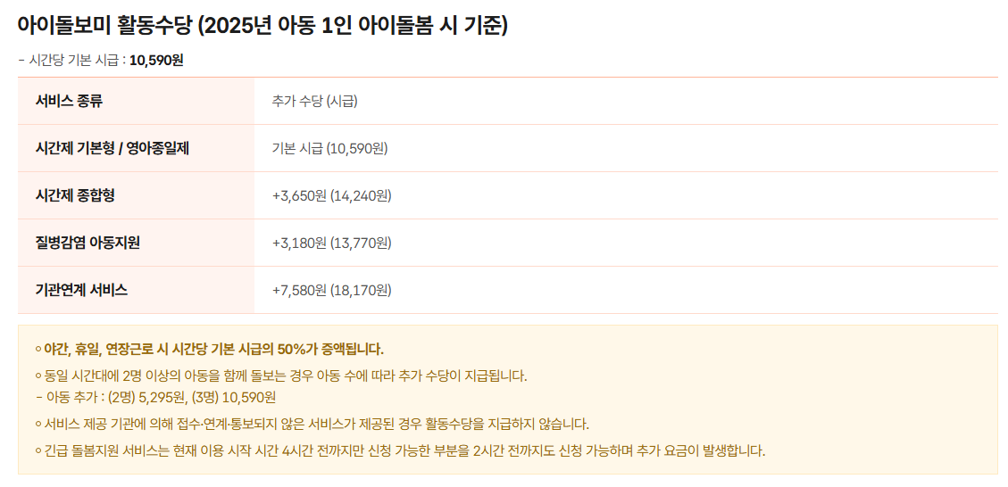 이는 정부에서 정한 기준으로, 아이돌봄 서비스 제공 시 적용되는 기본 수당입니다. 하지만 제공하는 서비스의 종류에 따라 추가 수당이 붙을 수 있습니다.