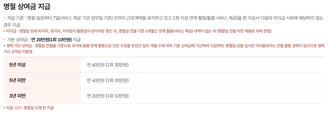 상여금은 명절이 도래하기 전 지급됩니다. 경력 가산 상여금의 경우, 명절일 당월에 입사한 아이돌보미는 해당되지 않으므로 유의해야 합니다.