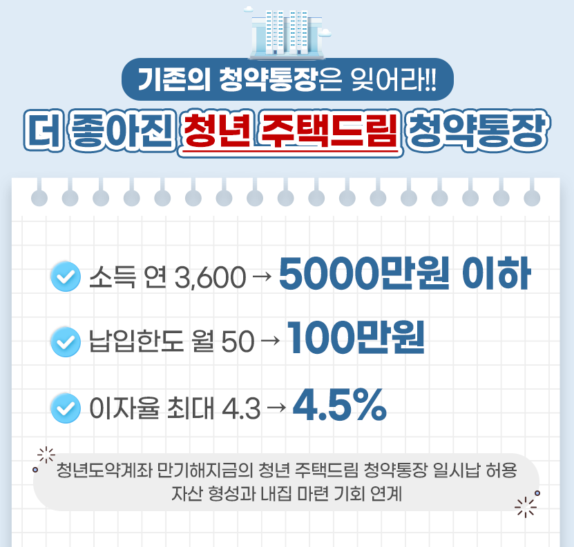 이 글에서는 청년 주택드림 청약통장의 가입 조건, 혜택, 가입 방법, 주의사항 등을 쉽게 정리해드리겠습니다.